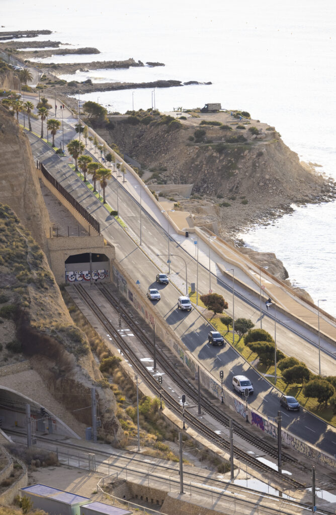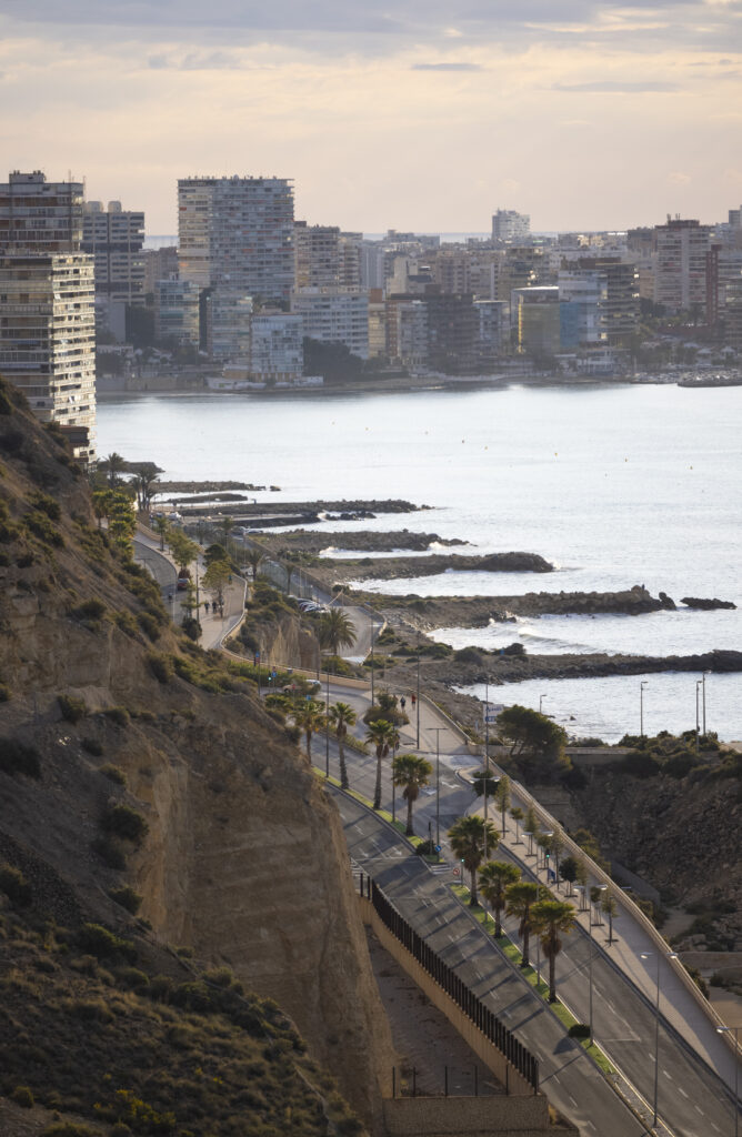 From the second and higher viewing point you have a great view on Avenida de Villajoyossa, the coastal road to San Juan and the little pebble stone beach Cala de la Sangueta.